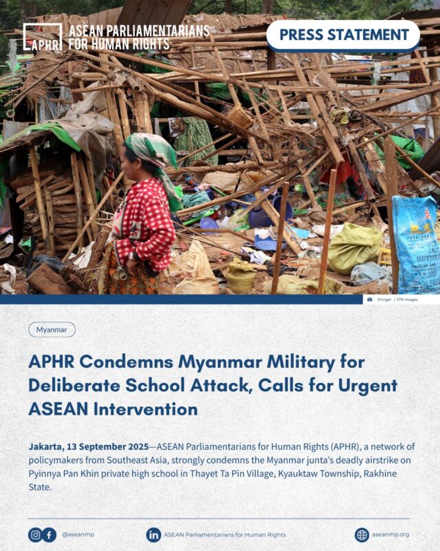The ASEAN Parliamentarians for Human Rights (APHR) has called for the prosecution of Myanmar’s military commission at the International Criminal Court (ICC) following an airstrike on September 12 that targeted two private high schools in Tharyar Tapan Village, Kyauktaw Township. The attack, carried out without any ongoing clashes in the area, resulted in the mass murder of students.