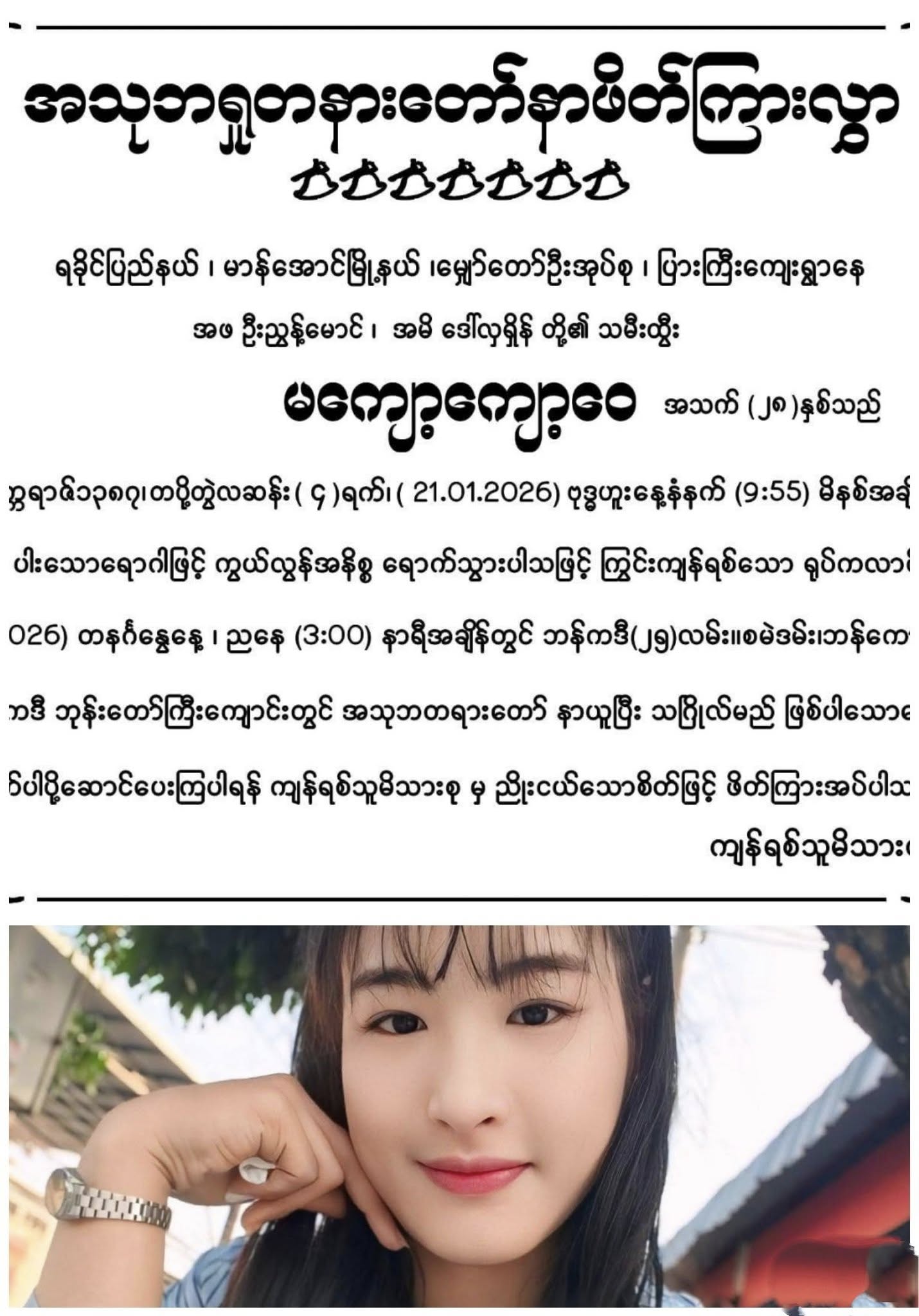 ဒါ့အပြင်လူသတ်တရားခံဖြစ်တဲ့ ကျော်မင်းနိုင်ကို တွေ့ရှိခဲ့ရင်လည်းဖုန်းနံပါတ် ၀၉၀၇၀၁၉၃၁၇ ကို အသိပေးဆက်သွယ်ပေးဖို့ကို မိသားစုဝင်တွေက မေ တ္တာရပ်ခံ ထားပါတယ်။