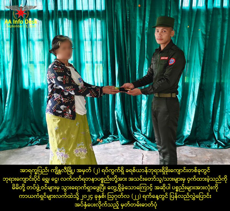 အဲဒါကြောင့် မိဘပြည်သူများ အနေ နဲ့ တိုက်ပွဲ အတွင်းနဲ့ တိုက်ပွဲ ပြီးဆုံးချိန်အတွင်းမပျက်စီးပဲ ပျောက်ဆုံးနေတဲ့ ပစ္စည်းများ ရှိခဲ့ရင် သက် ဆိုင်ရာ ဒေသ၊ နယ်မြေ အုပ်ချုပ်ရေးမှူး တွေဆီကို မှန်မှန်ကန်ကန် သတင်းပေးတိုင်ကြားဖို့ကို အာရက္ခတပ်တော် အေအေက အခုလို တိုက်တွန်းထားပါတယ်။