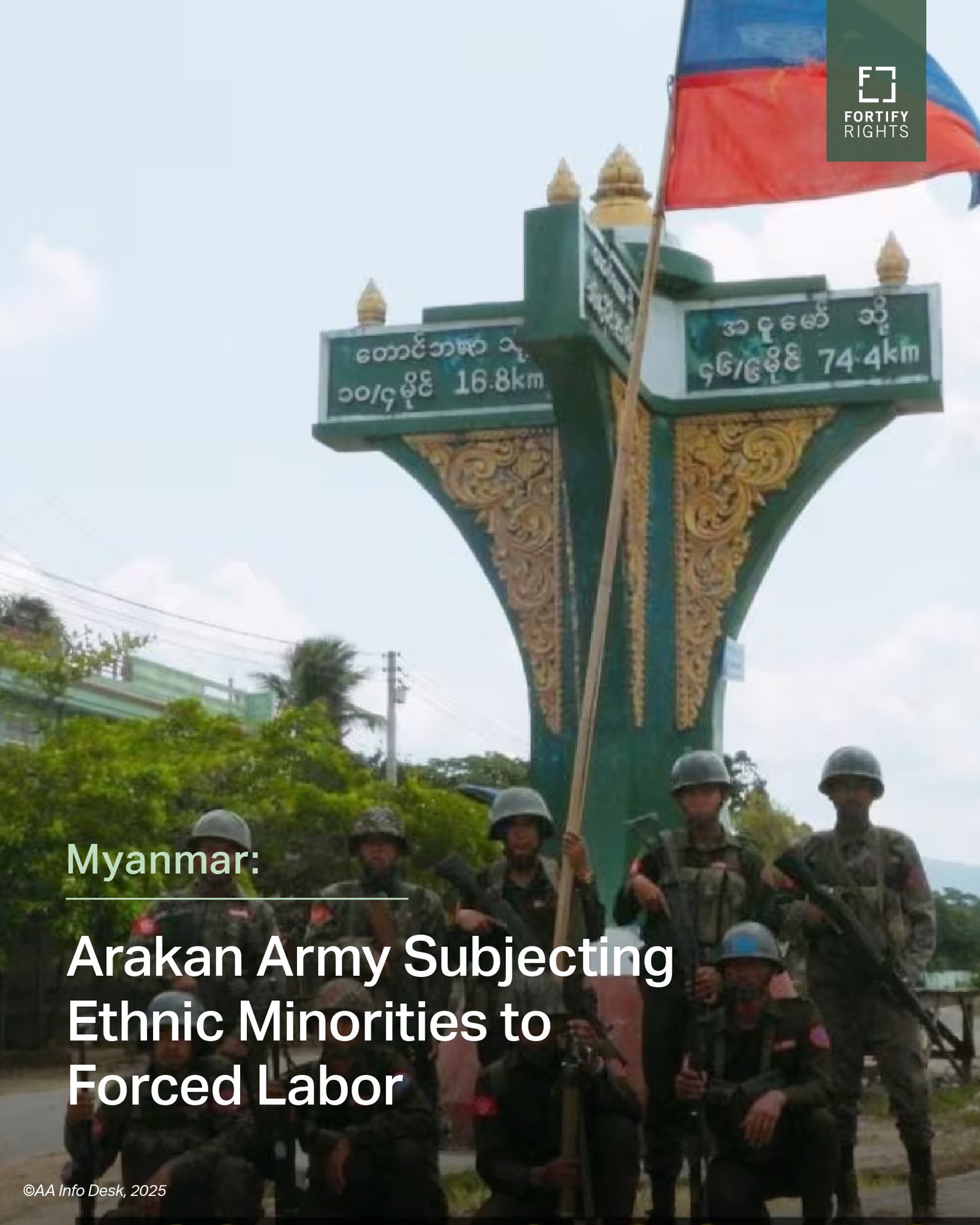 လူ့အခွင့်အရေးအဖွဲ့ဖြစ်တစ်ခုဖြစ်တဲ့ Fortify Rights အဖွဲ့ဟာ ရခိုင်မှာရှိတဲ့ မွတ်ဆလင် နဲ့ ဟိန္ဒူ အပါအဝင် လူ နည်းစုတိုင်းရင်းသားတွေကို အန္တရာယ်ရှိပြီးတော့ စစ်ရာဇဝတ်မှုမြောက်တဲ့ စစ် ဆင်ရေး နဲ့ ဆောက်လုပ်ရေးလုပ်တဲ့နေရာတွေမှာ လုပ်အားခတွေ မပေးဘဲ အာရက္ခတပ်တော်က အတင်းအကြပ်ခိုင်းစေတာတွေ ရှိနေတယ်လို့ ပြီးခဲ့တဲ့ အောက်တိုဘာလ ၂၂ ရက်နေ့မှာ ထုတ်ပြန်ပြောဆိုခဲ့ပါတယ်။