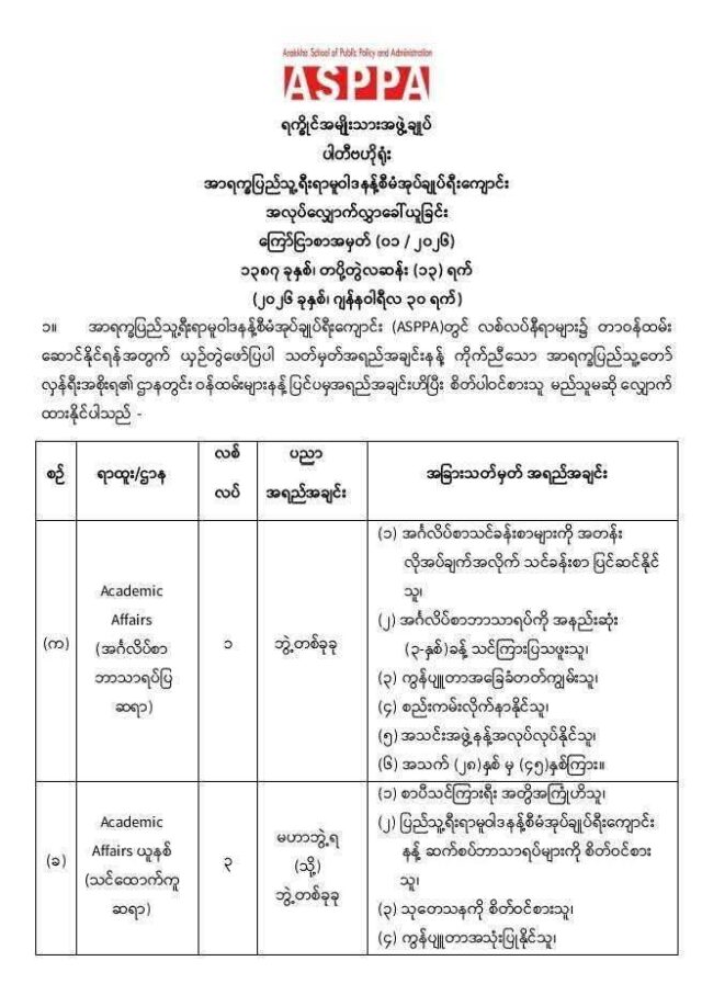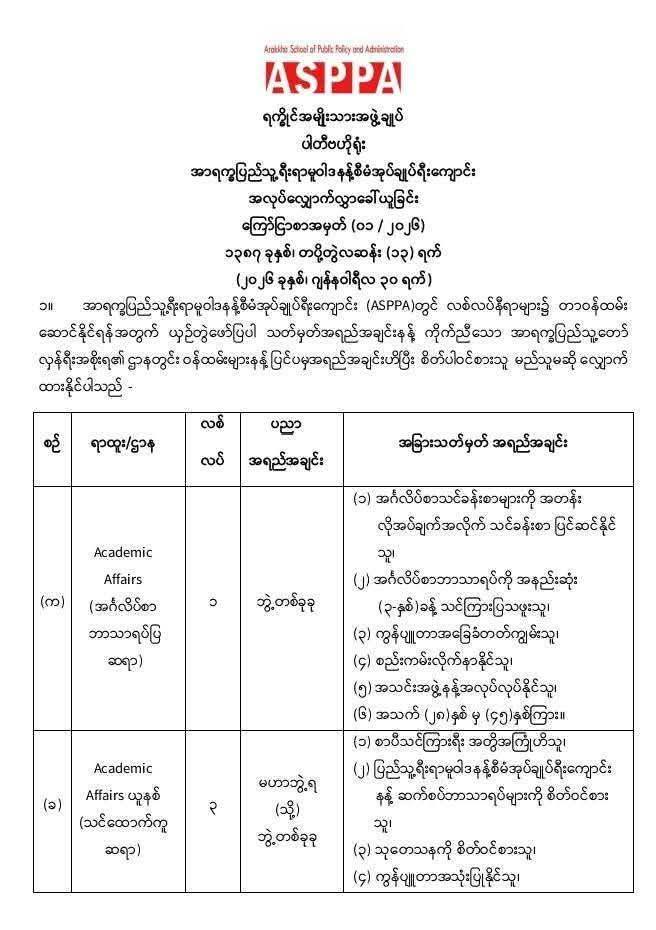 အာရက္ခပြည်သူ့ရေးရာမူဝါဒ နှင့် စီမံအုပ်ချုပ်ရေးကျောင်း Arakan School of Public Policy and Administration(ASPPA) ရဲ့ လစ်လပ်နေရာတွေမှာ တာဝန်ထမ်းဆောင်နိုင်ဖို့အတွက် ဝန်ထမ်းခေါ်ယူမှုကို လုပ်ဆောင်နေပါတယ်။