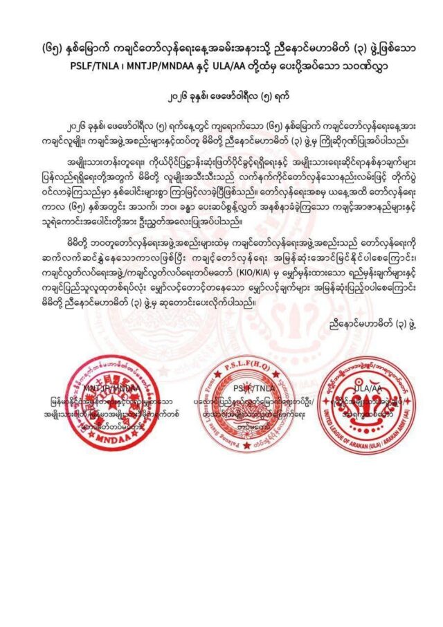 ဒီပြောဆိုချက်ကို ညီနောင် မဟာမိတ် ၃ ဖွဲ့ဖြစ်တဲ့ PSLF/TNLA ၊ MN TJP/MNDAA နဲ့ ULA/AA တို့က ဒီနေ့ ဖေဖော်ဝါရီလ (၅) ရက်နေ့ မှာ ကျရောက်တဲ့ (၆၅) နှစ်မြောက် ကချင်တော်လှန်ရေးနေ့ အခမ်းအနား သို့ ပေးပို့ခဲ့တဲ့ သဝဏ်လွှာထဲမှာ ထည့်သွင်းပြောဆိုထားခဲ့တာပါ။